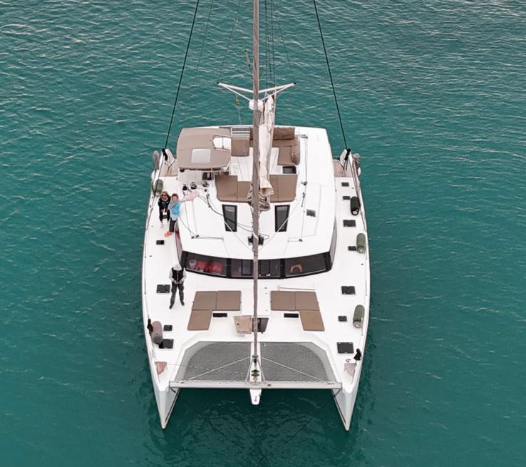 Verschiedene Bereiche an Bord laden zum Verweilen, Genießen und Entdecken ein. Ob oben auf der Flybridge hinter dem Steuerstand, auf dem Sonnendeck um eine gigantische Aussicht zu genießen oder im großen Cockpit auf der gepolsterten Sitzbank mit großem Esstisch um Mahlzeiten zu genießen. Unübertroffen genial ist jedoch die Lounge auf dem Vordeck, hinter dem breiten Netz zwischen den Rümpfen, mit einem gepolsterten Sofa und einem Cocktailtisch in der Mitte. Dies ist einer der besonderen Orte zum Sonnenbaden und tiefen Entspannen.